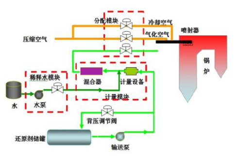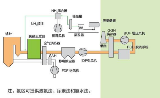 聯(lián)合工藝( SNCR-SCR ):兩段式反應(yīng):尿素或氨基化合物作為還原劑,爐膛內(nèi)壁噴入過量的還原劑脫硝(SNCR反應(yīng)區(qū),反應(yīng)溫度850~1100度),然后進(jìn)入SCR反應(yīng)區(qū),利用余量的還原劑在反應(yīng)溫度270~400度、SCR催化劑的條件下進(jìn)一步脫硝。該工藝通常適用于循環(huán)流化床鍋爐,能夠在較低的投資下實現(xiàn)高效率。