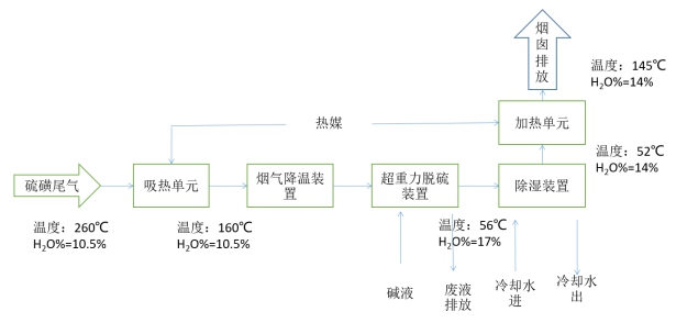 焚燒爐焚燒后的260℃煙氣先經過消白煙換熱裝置的煙氣取熱單元降溫到160℃后進入超重力裝置進行脫硫。