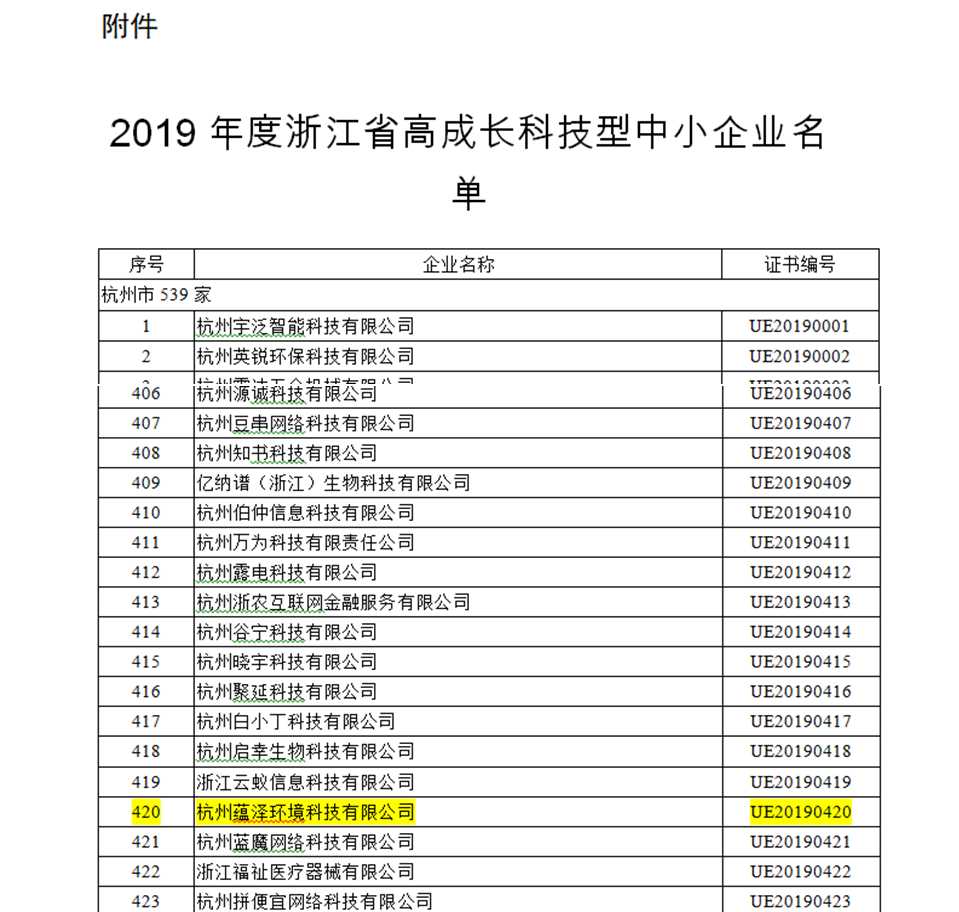 根據省科技廳印發的《浙江省高成長科技型中小企業評價指導性意見》(浙科發高〔2016〕87號)和《關于組織開展2019年度高成長科技型中小企業評價的通知》(浙科發高〔2019〕46號)有關規定,經科技管理部門組織評價、研究決定,評選結果客觀、真實,如實反映了企業的綜合實力?!昂贾萏N澤環境科技有限公司”認定為2019年度浙江省高成長科技型中小企業。