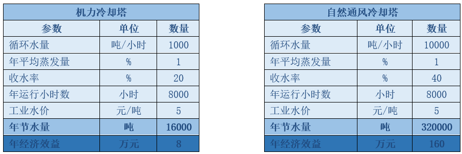 自然通風冷卻塔:循環水量:5000m3/h年節水量:160000噸;環境溫度≥-15℃、相對濕度不超過60%時無可視白霧現象。