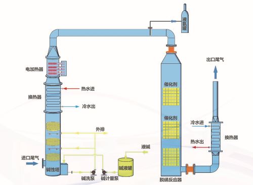 該工藝廢氣排煙溫度低于35℃,在進入脫硝反應器前先經(jīng)過堿洗塔清洗,去除工藝廢氣中含有的少量HCl等酸性氣體,后進入加熱器升溫至合適溫度。一段加熱利用脫硝后的尾氣進行換熱,熱媒采用除鹽水;二段加熱采用電加熱器。最終達到低溫催化劑的理想溫度范圍:100~150℃。經(jīng)加熱后的工藝廢氣進入脫硝反應器發(fā)生還原反應,生成氮氣和水。